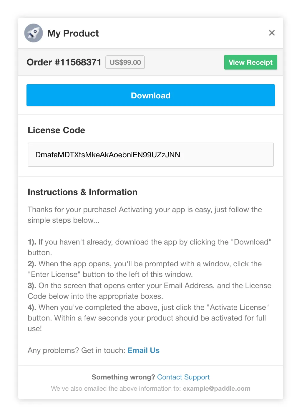Section titled “Checkout Complete Popup”The Paddle Checkout has several options on what to do on a completed checkout, by default the checkout will show a ‘Success’ message indicating that the transaction was successful.