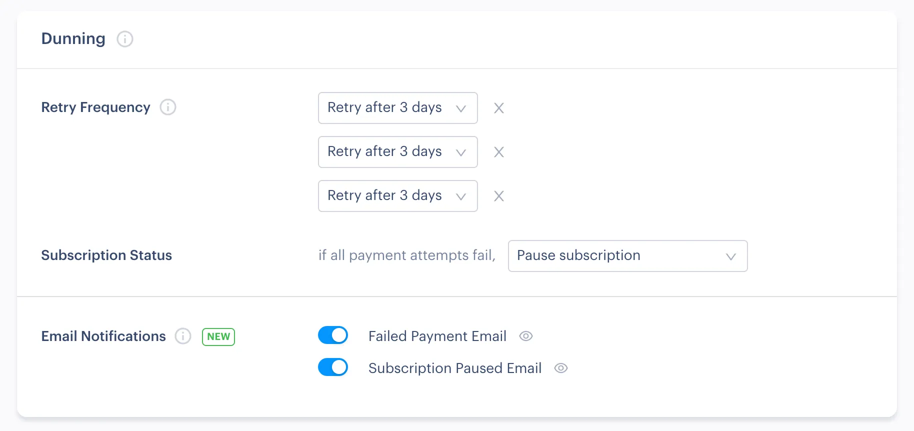 Within the Recover Settings dashboard page, we allow you to customize your own rules for retrying subscription payments. We recommend leaving a few days between each retry attempt to allow any temporary issue (such as insufficient funds) to resolve themselves.