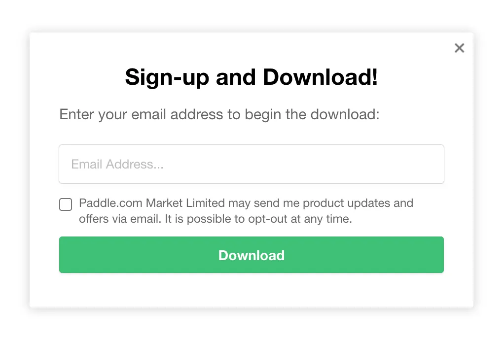 When enabled, Paddle.js can prompt for an Email Signup/Audience Subscription in order to initiate the download. This allows you to build up your customer marketing base while offering downloads on your website.