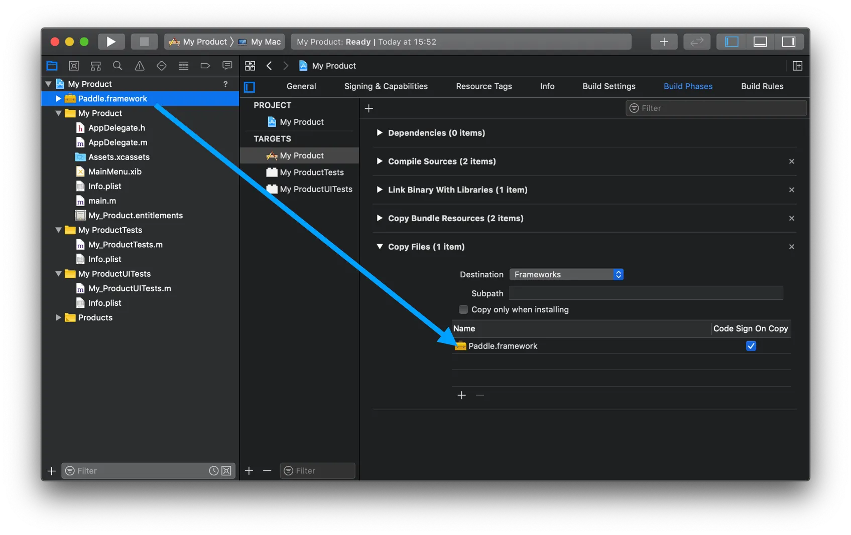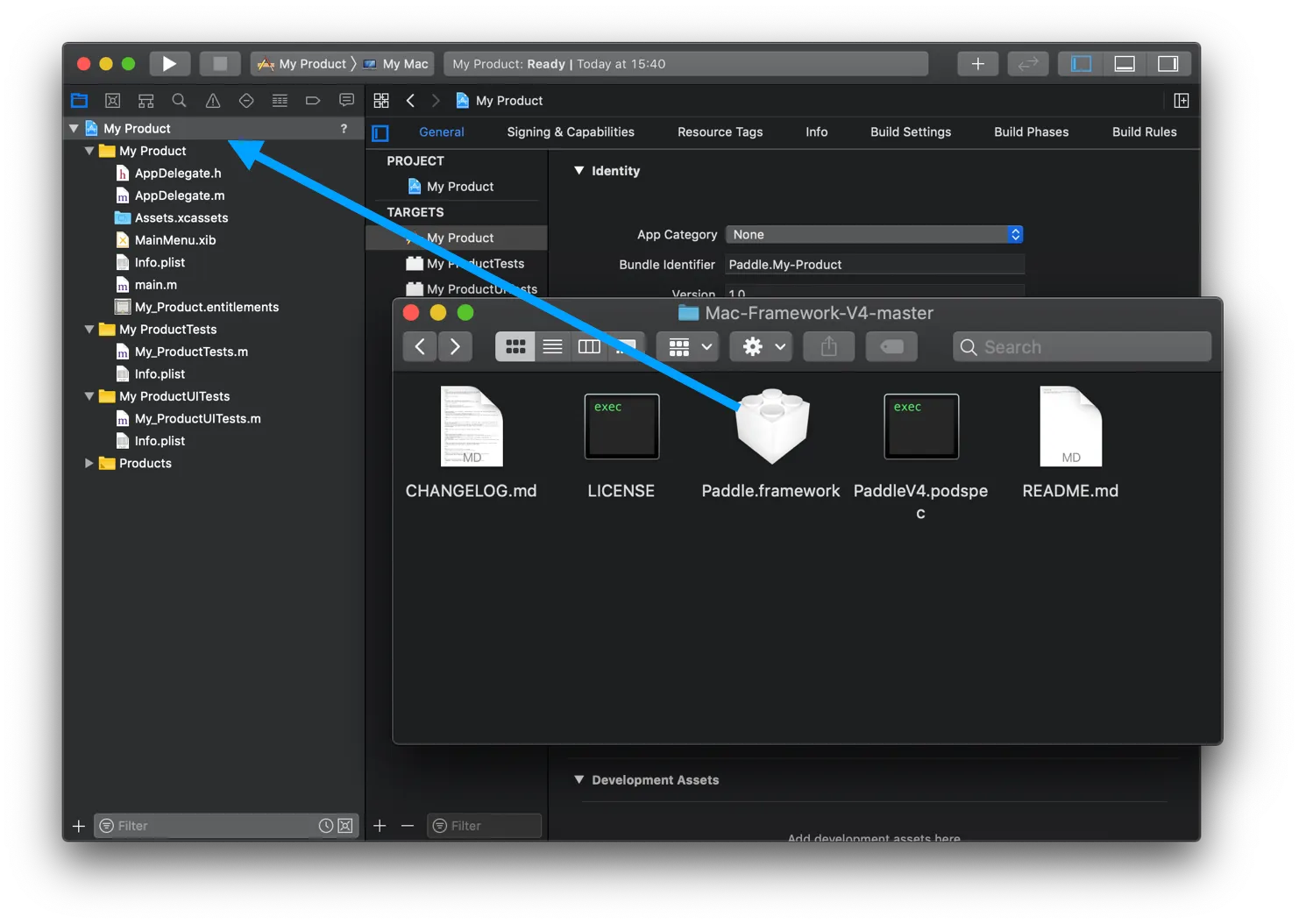 Section titled “1. Add to Project”Add the Paddle framework to your Xcode project by dragging from the Finder.