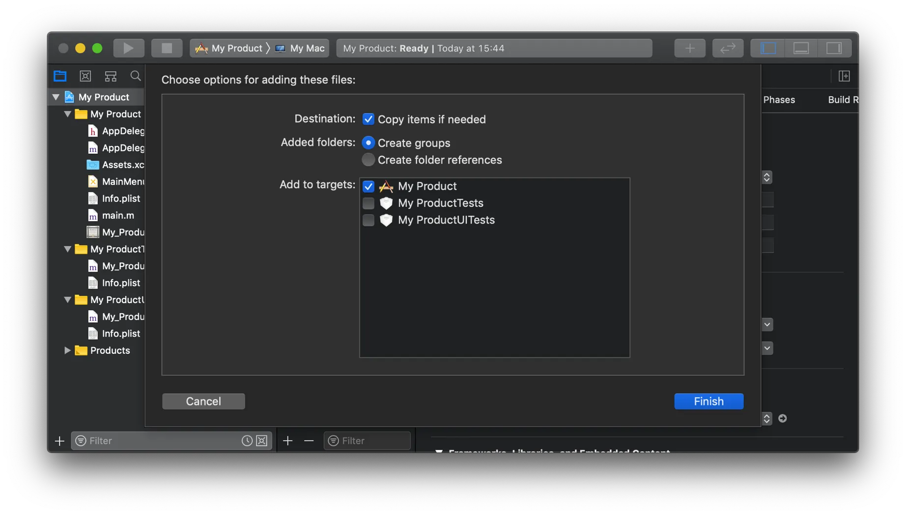 Section titled “3. Copy Files”Within Build Phases add a build phase (New Copy Files Build Phase). Make sure Destination is set to Frameworks.