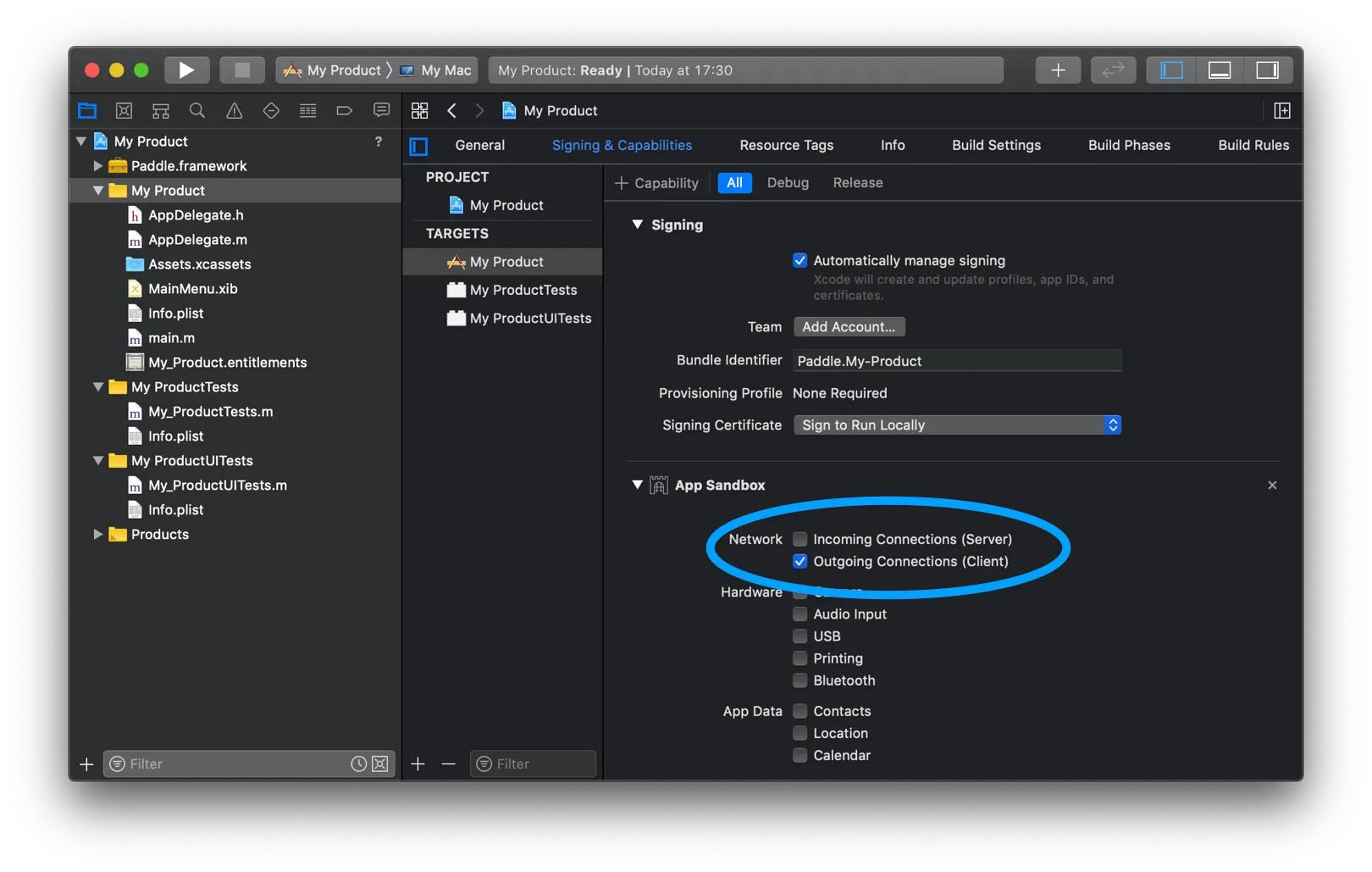 Section titled “4. Sandbox Settings”If your app is sandboxed you should enable “Outgoing Connections (Client)” in your Signing & Capabilities tab to allow the framework to send data to Paddle.